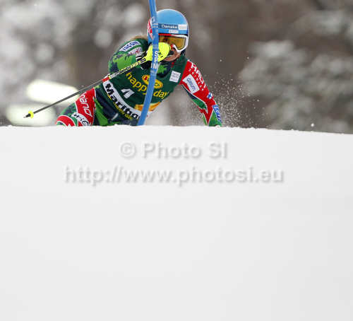 : Tanja Poutiainen of Finland skiing in first run of women slalom Golden Fox trophy race of Audi FIS Alpine skiing World cup 2012-2013 in Maribor, Slovenia. Women slalom race of Audi FIS Alpine skiing World cup was held in Maribor, Slovenia, on Sunday, 27th of January 2013.