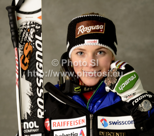 : Second placed Lara Gut of Switzerland celebrates her medal won in women Super-g race of FIS Alpine skiing World Championships in Schladming, Austria. Women super-g race of FIS Alpine skiing World championships Schladming 2013, was held in Scladming, Austria, on Tuesday, 5th of February 2013.