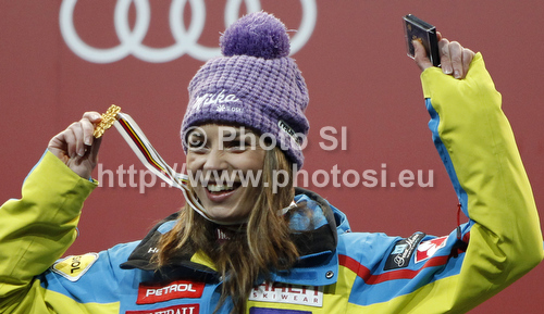 : Winner and new super-g World Champion Tina Maze of Slovenia celebrates her medal won in women Super-g race of FIS Alpine skiing World Championships in Schladming, Austria. Women super-g race of FIS Alpine skiing World championships Schladming 2013, was held in Scladming, Austria, on Tuesday, 5th of February 2013.