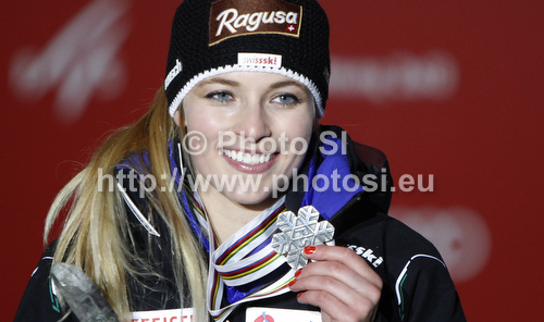 : Second placed Lara Gut of Switzerland celebrates her medal won in women Super-g race of FIS Alpine skiing World Championships in Schladming, Austria. Women super-g race of FIS Alpine skiing World championships Schladming 2013, was held in Scladming, Austria, on Tuesday, 5th of February 2013.