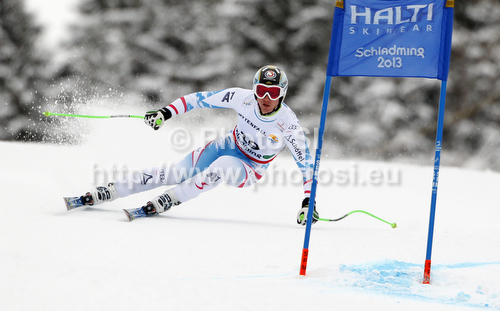 : Fourth placed Hannes Reichelt of Austria skiing in men Super-g race of FIS Alpine skiing World Championships in Schladming, Austria. Men super-g race of FIS Alpine skiing World championships Schladming 2013, was held in Scladming, Austria, on Wednesday, 6th of February 2013.