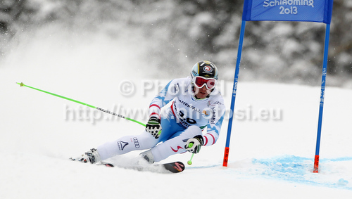 : Fourth placed Hannes Reichelt of Austria skiing in men Super-g race of FIS Alpine skiing World Championships in Schladming, Austria. Men super-g race of FIS Alpine skiing World championships Schladming 2013, was held in Scladming, Austria, on Wednesday, 6th of February 2013.