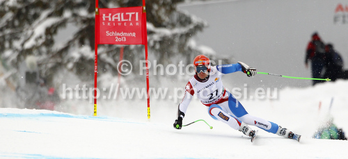 : Patrick Kueng of Switzerland skiing in men Super-g race of FIS Alpine skiing World Championships in Schladming, Austria. Men super-g race of FIS Alpine skiing World championships Schladming 2013, was held in Scladming, Austria, on Wednesday, 6th of February 2013.