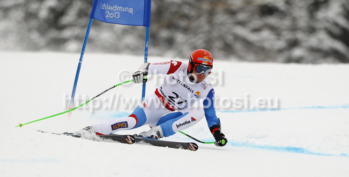 : Patrick Kueng of Switzerland skiing in men Super-g race of FIS Alpine skiing World Championships in Schladming, Austria. Men super-g race of FIS Alpine skiing World championships Schladming 2013, was held in Scladming, Austria, on Wednesday, 6th of February 2013.