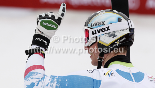 : Fourth placed Hannes Reichelt of Austria reacts in finish of men Super-g race of FIS Alpine skiing World Championships in Schladming, Austria. Men super-g race of FIS Alpine skiing World championships Schladming 2013, was held in Scladming, Austria, on Wednesday, 6th of February 2013.