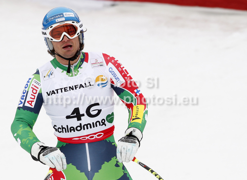 : Marcus Sandell of Finland reacts in finish of men Super-g race of FIS Alpine skiing World Championships in Schladming, Austria. Men super-g race of FIS Alpine skiing World championships Schladming 2013, was held in Scladming, Austria, on Wednesday, 6th of February 2013.