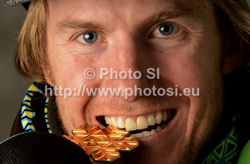 : Winner and new Super-G World ChampionTed Ligety of USA celebrates his medal won in men Super-g race of FIS Alpine skiing World Championships in Schladming, Austria. Men super-g race of FIS Alpine skiing World championships Schladming 2013, was held in Schladming, Austria, on Wednesday, 6th of February 2013.