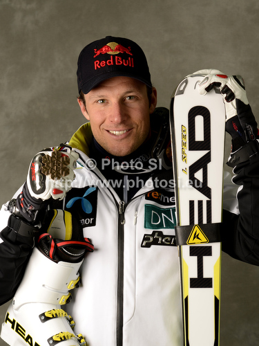 : Third placed Aksel Lund Svindal of Norway celebrates his medal won in men Super-g race of FIS Alpine skiing World Championships in Schladming, Austria. Men super-g race of FIS Alpine skiing World championships Schladming 2013, was held in Schladming, Austria, on Wednesday, 6th of February 2013.