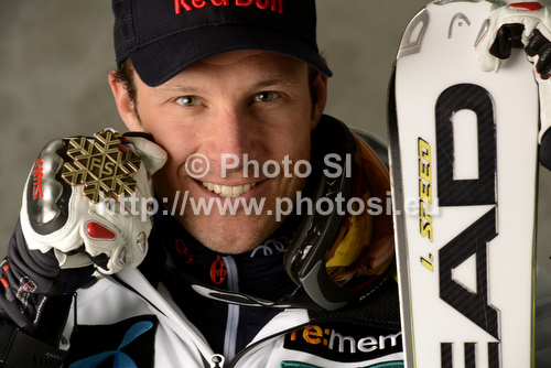 Schladming ,Austria - 06.02.2013 : Third placed Aksel Lund Svindal of Norway celebrates his medal won in men Super-g race of FIS Alpine skiing World Championships in Schladming, Austria. Men super-g race of FIS Alpine skiing World championships Schladming 2013, was held in Schladming, Austria, on Wednesday, 6th of February 2013. Photo by: Erich Spiess / pool / PhotoSI