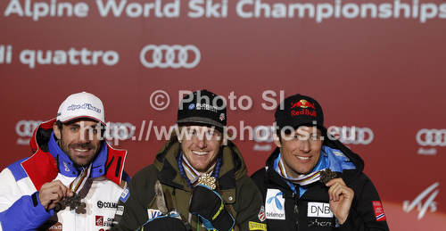 : Winner Ted Ligety of USA (M), second placed Gauthier De Tessieres of France (L) and third placed Aksel Lund Svindal of Norway (R) celebrate their medals won in men Super-g race of FIS Alpine skiing World Championships in Schladming, Austria. Men super-g race of FIS Alpine skiing World championships Schladming 2013, was held in Scladming, Austria, on Wednesday, 6th of February 2013.