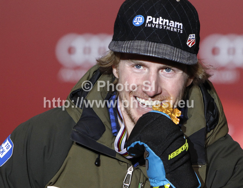 Schladming ,Austria - 06.02.2013 : Winner and new Super-g World champion Ted Ligety of USA celebrates his medal won in men Super-g race of FIS Alpine skiing World Championships in Schladming, Austria. Men super-g race of FIS Alpine skiing World championships Schladming 2013, was held in Scladming, Austria, on Wednesday, 6th of February 2013. Photo by: Mitja Smid Bricelj