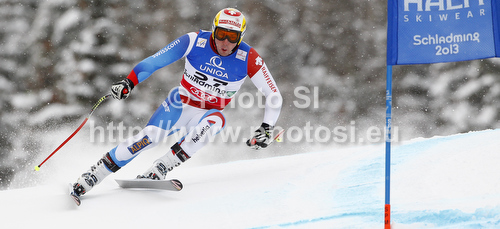 : Vitus Lueoend of Switzerland skiing in first training for men downhill race of FIS Alpine skiing World Championships in Schladming, Austria. First training for men downhill race of FIS Alpine skiing World championships Schladming 2013, was held in Schladming, Austria, on Thursday, 7th of February 2013.