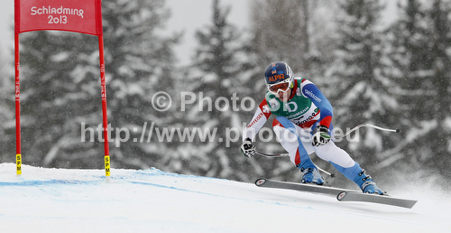 : Dominique Gisin of Switzerland skiing in second training for women downhill race of FIS Alpine skiing World Championships in Schladming, Austria. Second training for women downhill race of FIS Alpine skiing World championships Schladming 2013, was held in Schladming, Austria, on Thursday, 7th of February 2013.