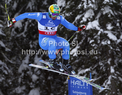 : Dominik Paris of Italy skiing in second training for men downhill race of FIS Alpine skiing World Championships in Schladming, Austria. Second training for men downhill race of FIS Alpine skiing World championships Schladming 2013, was held in Schladming, Austria, on Friday, 8th of February 2013.