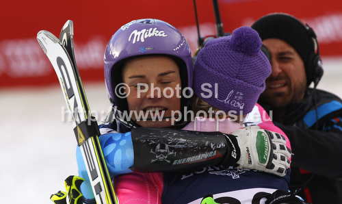: Winner and new super combined World Champion Maria Hoefl-Riesch of Germany (R) accepting congratulations from second placed Tina Maze of Slovenia (L) in finish of women super combined race of FIS Alpine skiing World Championships in Schladming, Austria. Women super combined race of FIS Alpine skiing World championships Schladming 2013, was held in Schladming, Austria, on Friday, 8th of February 2013.