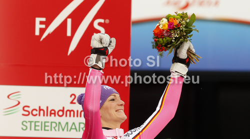 : Winner and new super combined World champions Maria Hoefl-Riesch of Germany celebrates her medal won in women super combined race of FIS Alpine skiing World Championships in Schladming, Austria. Women super combined race of FIS Alpine skiing World championships Schladming 2013, was held in Schladming, Austria, on Friday, 8th of February 2013.