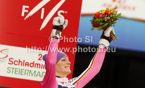 Schladming ,Austria - 08.02.2013 : Winner and new super combined World champions Maria Hoefl-Riesch of Germany celebrates her medal won in women super combined race of FIS Alpine skiing World Championships in Schladming, Austria. Women super combined race of FIS Alpine skiing World championships Schladming 2013, was held in Schladming, Austria, on Friday, 8th of February 2013. Photo by: Primoz Jeroncic