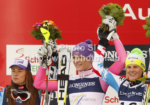 : Winner and new super combined World champions Maria Hoefl-Riesch of Germany (M), second placed Tina Maze of Slovenia (L) and third placed Nicole Hosp of Austria (R) celebrate their medals won in women super combined race of FIS Alpine skiing World Championships in Schladming, Austria. Women super combined race of FIS Alpine skiing World championships Schladming 2013, was held in Schladming, Austria, on Friday, 8th of February 2013.