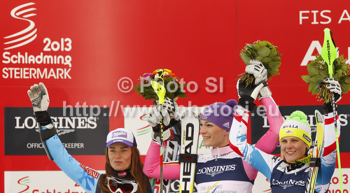 : Winner and new super combined World champions Maria Hoefl-Riesch of Germany (M), second placed Tina Maze of Slovenia (L) and third placed Nicole Hosp of Austria (R) celebrate their medals won in women super combined race of FIS Alpine skiing World Championships in Schladming, Austria. Women super combined race of FIS Alpine skiing World championships Schladming 2013, was held in Schladming, Austria, on Friday, 8th of February 2013.