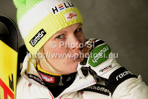 : Third placed Nicole Hosp of Austria celebrates her medal won in women super combined race of FIS Alpine skiing World Championships in Schladming, Austria. Women super combined race of FIS Alpine skiing World championships Schladming 2013, was held in Schladming, Austria, on Friday, 8th of February 2013.