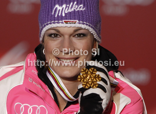 : Winner and new super combined World Champion Maria Hoefl-Riesch of Germany celebrates her medal won in women super combined race of FIS Alpine skiing World Championships in Schladming, Austria. Women super combined race of FIS Alpine skiing World championships Schladming 2013, was held in Schladming, Austria, on Friday, 8th of February 2013.