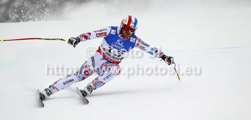 : Third placed David Poisson of France skiing in men downhill race of FIS Alpine skiing World Championships in Schladming, Austria. Men downhill race of FIS Alpine skiing World championships Schladming 2013, was held in Schladming, Austria, on Saturday, 9th of February 2013.