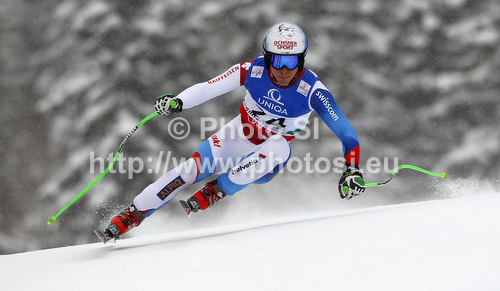 : Carlo Janka of Switzerland skiing in men downhill race of FIS Alpine skiing World Championships in Schladming, Austria. Men downhill race of FIS Alpine skiing World championships Schladming 2013, was held in Schladming, Austria, on Saturday, 9th of February 2013.