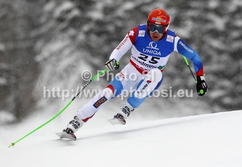 : Seventh placed Patrick Kueng of Switzerland skiing in men downhill race of FIS Alpine skiing World Championships in Schladming, Austria. Men downhill race of FIS Alpine skiing World championships Schladming 2013, was held in Schladming, Austria, on Saturday, 9th of February 2013.