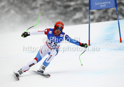 : Seventh placed Patrick Kueng of Switzerland skiing in men downhill race of FIS Alpine skiing World Championships in Schladming, Austria. Men downhill race of FIS Alpine skiing World championships Schladming 2013, was held in Schladming, Austria, on Saturday, 9th of February 2013.