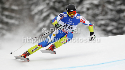: Klemen Kosi of Slovenia skiing in men downhill race of FIS Alpine skiing World Championships in Schladming, Austria. Men downhill race of FIS Alpine skiing World championships Schladming 2013, was held in Schladming, Austria, on Saturday, 9th of February 2013.