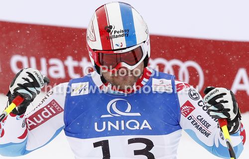 : Third placed David Poisson of France reacts in finish of men downhill race of FIS Alpine skiing World Championships in Schladming, Austria. Men downhill race of FIS Alpine skiing World championships Schladming 2013, was held in Schladming, Austria, on Saturday, 9th of February 2013.