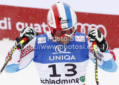 Schladming ,Austria - 09.02.2013 : Third placed David Poisson of France reacts in finish of men downhill race of FIS Alpine skiing World Championships in Schladming, Austria. Men downhill race of FIS Alpine skiing World championships Schladming 2013, was held in Schladming, Austria, on Saturday, 9th of February 2013. Photo by: Mitja Smid Bricelj