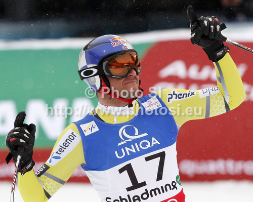 : Winner and new downhill World Champion Aksel Lund Svindal of Norway reacts in finish of men downhill race of FIS Alpine skiing World Championships in Schladming, Austria. Men downhill race of FIS Alpine skiing World championships Schladming 2013, was held in Schladming, Austria, on Saturday, 9th of February 2013.
