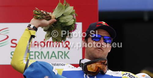 : Winner and new downhill World champion Aksel Lund Svindal of Norway celebrates his medal won in men downhill race of FIS Alpine skiing World Championships in Schladming, Austria. Men downhill race of FIS Alpine skiing World championships Schladming 2013, was held in Schladming, Austria, on Saturday, 9th of February 2013.