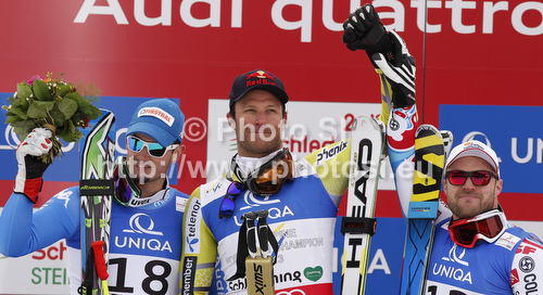 Schladming ,Austria - 09.02.2013 : Winner and new downhill World champion Aksel Lund Svindal of Norway (M), second placed Dominik Paris of Italy (L) and third placed David Poisson of France (R) celebrate their medals won in men downhill race of FIS Alpine skiing World Championships in Schladming, Austria. Men downhill race of FIS Alpine skiing World championships Schladming 2013, was held in Schladming, Austria, on Saturday, 9th of February 2013. Photo by: Mitja Smid Bricelj