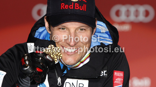 : Winner and new downhill World Champion Aksel Lund Svindal of Norway celebrates his medal won in men downhill race of FIS Alpine skiing World Championships in Schladming, Austria. Men downhill race of FIS Alpine skiing World championships Schladming 2013, was held in Schladming, Austria, on Saturday, 9th of February 2013.