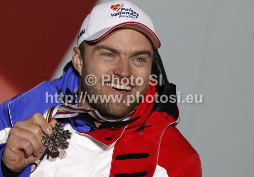 Schladming ,Austria - 09.02.2013 : Third placed David Poisson of France celebrates his medal won in men downhill race of FIS Alpine skiing World Championships in Schladming, Austria. Men downhill race of FIS Alpine skiing World championships Schladming 2013, was held in Schladming, Austria, on Saturday, 9th of February 2013. Photo by: Mitja Smid Bricelj