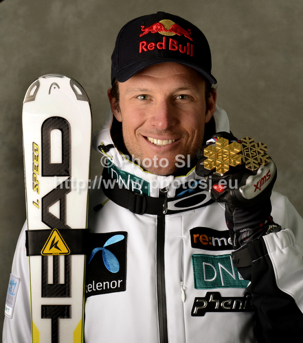 : Winner and new downhill World Champion Aksel Lund Svindal of Norway celebrates his medal won in men downhill race of FIS Alpine skiing World Championships in Schladming, Austria. Men downhill race of FIS Alpine skiing World championships Schladming 2013, was held in Schladming, Austria, on Saturday, 9th of February 2013.