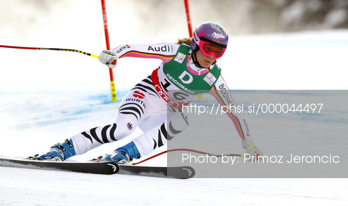 : Third placed Maria Hoefl-Riesch of Germany skiing in women downhill race of FIS Alpine skiing World Championships in Schladming, Austria. Women downhill race of FIS Alpine skiing World championships Schladming 2013, was held in Schladming, Austria, on Sunday, 10th of February 2013.