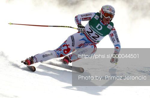 : Winner and new women downhill World Champion Marion Rolland of France skiing in women downhill race of FIS Alpine skiing World Championships in Schladming, Austria. Women downhill race of FIS Alpine skiing World championships Schladming 2013, was held in Schladming, Austria, on Sunday, 10th of February 2013.