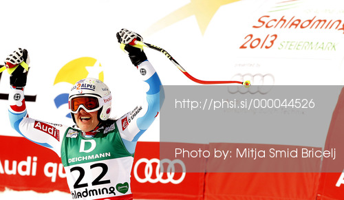 : Winner and new women downhill World Champion Marion Rolland of France reacts in finish of women downhill race of FIS Alpine skiing World Championships in Schladming, Austria. Women downhill race of FIS Alpine skiing World championships Schladming 2013, was held in Schladming, Austria, on Sunday, 10th of February 2013.