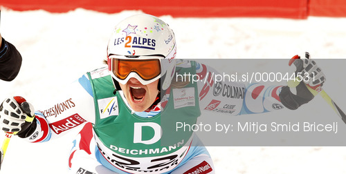 : Winner and new women downhill World Champion Marion Rolland of France reacts in finish of women downhill race of FIS Alpine skiing World Championships in Schladming, Austria. Women downhill race of FIS Alpine skiing World championships Schladming 2013, was held in Schladming, Austria, on Sunday, 10th of February 2013.