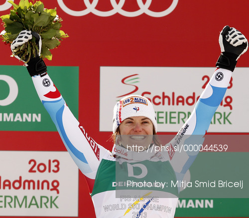 Schladming ,Austria - 10.02.2013 : Winner and new women downhill World Champion Marion Rolland of France celebrates her medal won in women downhill race of FIS Alpine skiing World Championships in Schladming, Austria. Women downhill race of FIS Alpine skiing World championships Schladming 2013, was held in Schladming, Austria, on Sunday, 10th of February 2013. Photo by: Mitja Smid Bricelj