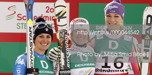 : Winner and new women downhill World Champion Marion Rolland of France (M), second placed Nadia Fanchini of Italy (L) and third placed Maria Hoefl-Riesch of Germany (R) celebrate their medals won in women downhill race of FIS Alpine skiing World Championships in Schladming, Austria. Women downhill race of FIS Alpine skiing World championships Schladming 2013, was held in Schladming, Austria, on Sunday, 10th of February 2013.