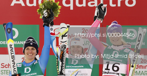 Schladming ,Austria - 10.02.2013 : Winner and new women downhill World Champion Marion Rolland of France (M), second placed Nadia Fanchini of Italy (L) and third placed Maria Hoefl-Riesch of Germany (R) celebrate their medals won in women downhill race of FIS Alpine skiing World Championships in Schladming, Austria. Women downhill race of FIS Alpine skiing World championships Schladming 2013, was held in Schladming, Austria, on Sunday, 10th of February 2013. Photo by: Mitja Smid Bricelj
