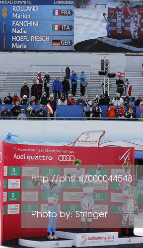 Schladming ,Austria - 10.02.2013 : Winner and new women downhill World Champion Marion Rolland of France (M), second placed Nadia Fanchini of Italy (L) and third placed Maria Hoefl-Riesch of Germany (R) celebrate their medals won in women downhill race of FIS Alpine skiing World Championships in Schladming, Austria. Women downhill race of FIS Alpine skiing World championships Schladming 2013, was held in Schladming, Austria, on Sunday, 10th of February 2013. Photo by: Stringer