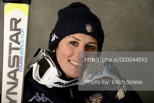 Schladming ,Austria - 10.02.2013 : Second placed Nadia Fanchini of Italy celebrates her medal won in women downhill race of FIS Alpine skiing World Championships in Schladming, Austria. Women downhill race of FIS Alpine skiing World championships Schladming 2013, was held in Schladming, Austria, on Sunday, 10th of February 2013. Photo by: Erich Spiess / pool / PhotoSI