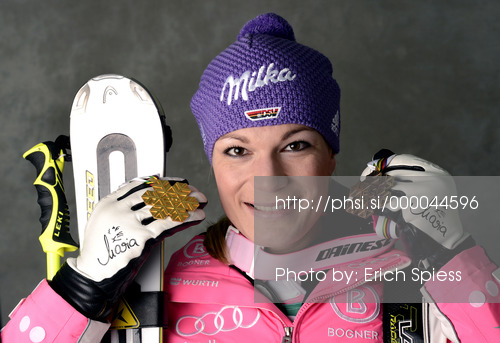 : Third placed Maria Hoefl-Riesch of Germany celebrates her medal won in women downhill race of FIS Alpine skiing World Championships in Schladming, Austria. Women downhill race of FIS Alpine skiing World championships Schladming 2013, was held in Schladming, Austria, on Sunday, 10th of February 2013.