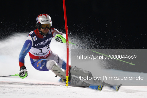 : Fifth placed Sandro Viletta of Switzerland skiing in slalom of men super combined race of FIS Alpine skiing World Championships in Schladming, Austria. Slalom of men super combined race of FIS Alpine skiing World championships Schladming 2013, was held in Schladming, Austria, on Monday, 11th of February 2013.