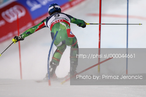 : Andreas Romar of Finland skiing in slalom of men super combined race of FIS Alpine skiing World Championships in Schladming, Austria. Slalom of men super combined race of FIS Alpine skiing World championships Schladming 2013, was held in Schladming, Austria, on Monday, 11th of February 2013.